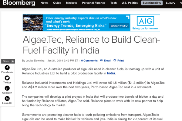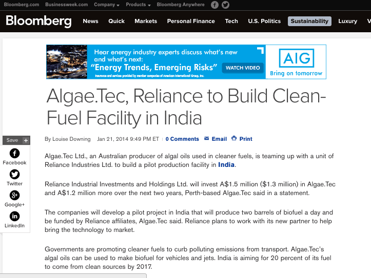 Bloomberg news report on Algae.Tec